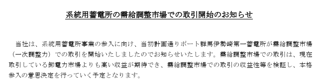 【蓄電関連】ポート:群馬伊勢崎第一蓄電所、需給調整市場で取引開始