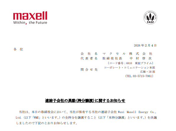【提携・M&A・新会社】マクセル:無錫子会社の全持分を中国企業へ譲渡