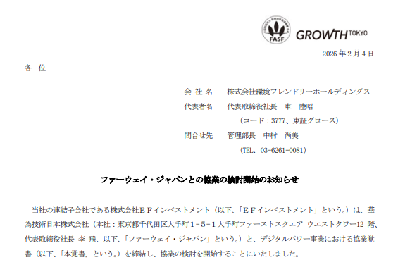 【提携・M&A・新会社】環境フレンドリーHD:ファーウェイ・ジャパンと協業検討開始