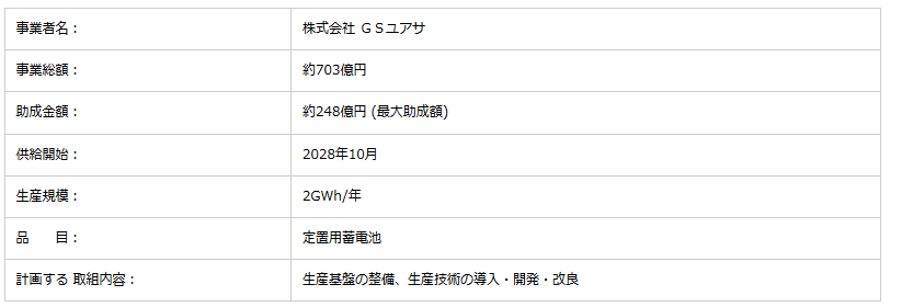 【蓄電関連】GSユアサ:国産定置用リチウムイオン電池、供給確保計画が経産省認定