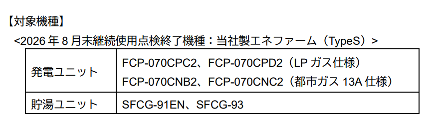 【給湯・空調・換気】ENEOS:家庭用燃料電池エネファームTypeSの継続使用点検を2026年8月末で終了