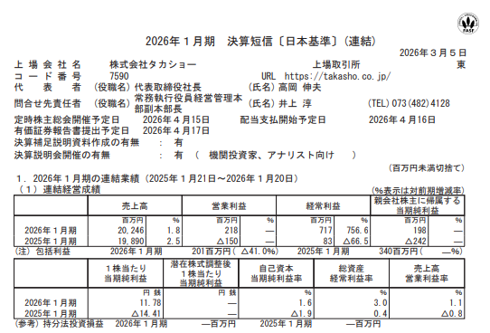 【決算】タカショー:非住宅と照明伸長で黒字転換、27年1月期も増収増益見込む