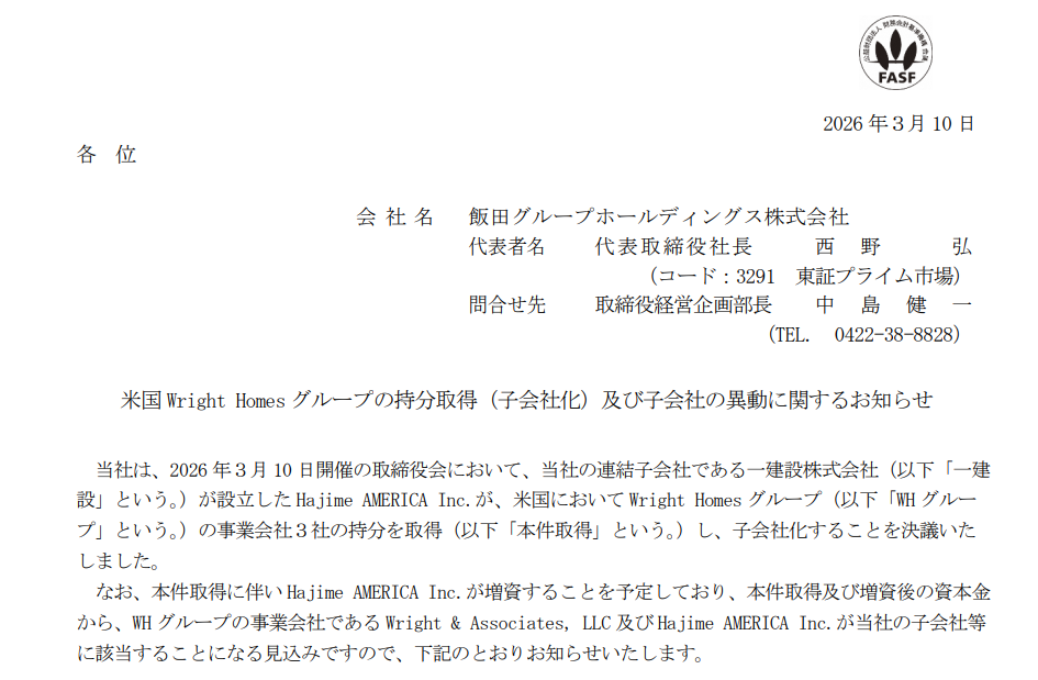 【各種住宅・建築・他】エフティグループ:LED販売事業を子会社へ分割し効率化、来年2月に吸収分割を実施