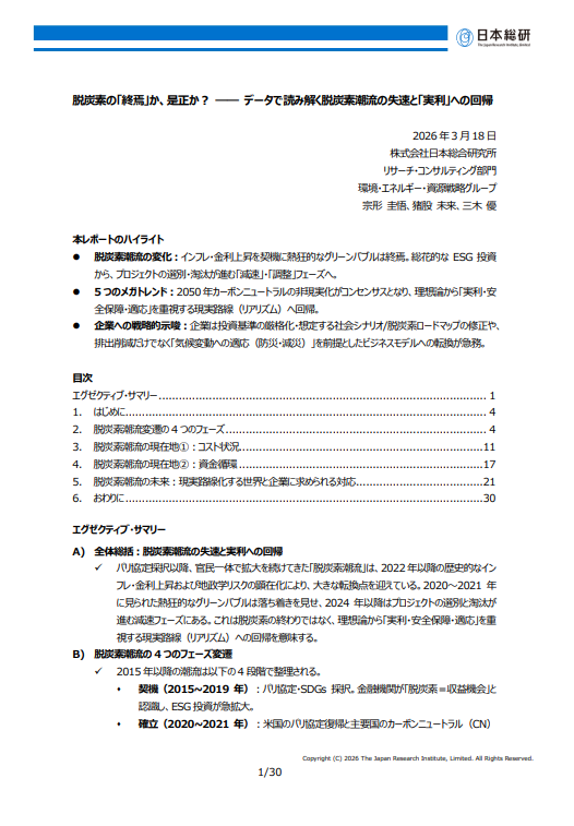 【資料】日本総研:脱炭素の5大潮流、実利重視への転換示す