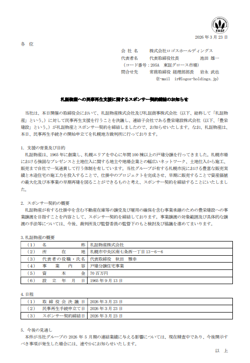 【提携・M&A・新会社】ロゴスホールディングス:札証物産の再建支援へ、豊栄建設がスポンサー契約締結