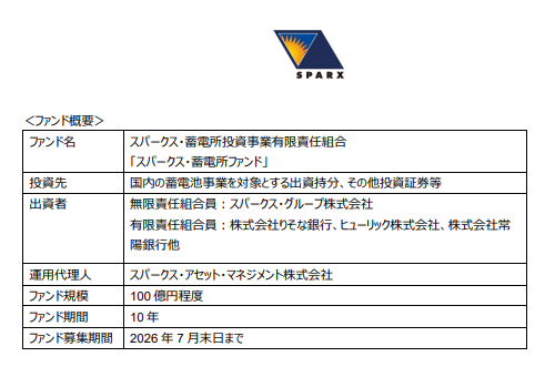【蓄電関連】スパークス・グループ:蓄電所ファンドを設立、市場運用型で100億円規模目指す