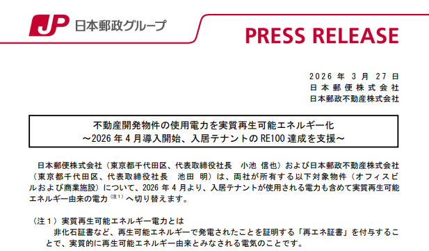 【脱炭素・SDGs・ESG】日本郵便:不動産開発物件を実質再エネ化、入居テナントのRE100達成支援