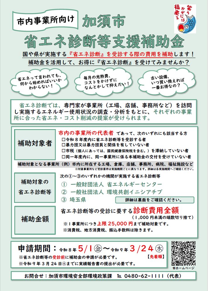 【補助金】加須市:事業者向け省エネ診断費を補助、1事業所上限2万5000円