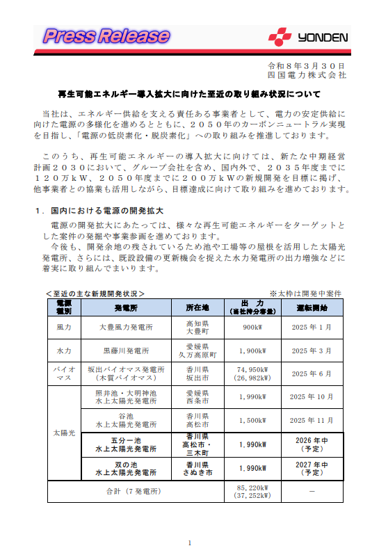 【脱炭素・SDGs・ESG】四国電力:再エネ導入を加速、須崎市の既設太陽光3件を取得