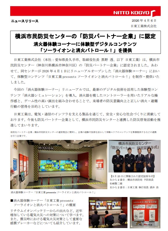 【防災・防犯・事故等】日東工業:横浜市民防災センターの防災パートナー認定、電気火災対策を発信
