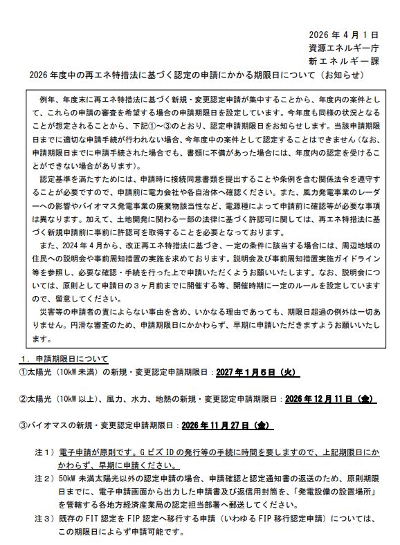 【政策】資源エネルギー庁:再エネ認定の年度内申請期限を公表、10kW以上地上設置太陽光は新規認定の最終年度に