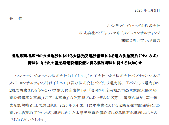 【太陽光発電】フィンテック グローバル:南相馬市の公共施設PPAで協定締結、自治体向け再エネ導入を推進