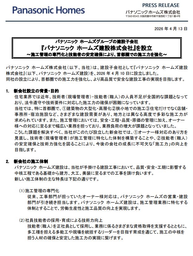 【提携・M&A・新会社】パナソニックホームズ:建設子会社を新設し首都圏施工を強化。施工管理の専門化で品質向上へ