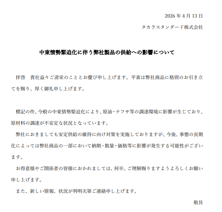 【各種住宅・建築・他】タカラスタンダード:中東情勢緊迫化で原材料調達に不安定要因。納期・数量・価格への影響を警戒