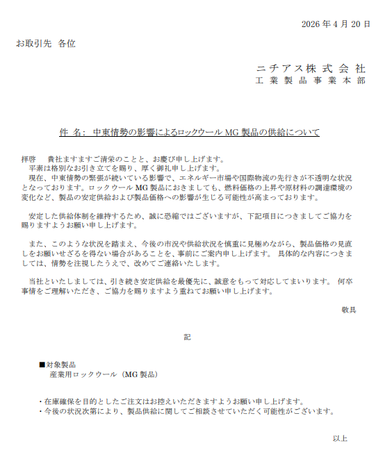 【断熱材・窓】ニチアス:ロックウールMG製品で供給懸念、中東情勢受け価格見直しも