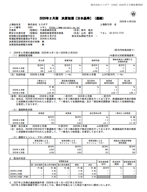 【決算】エスポア:26年2月期は最終黒字に転換、不動産コンサルと開発販売が収益押し上げ