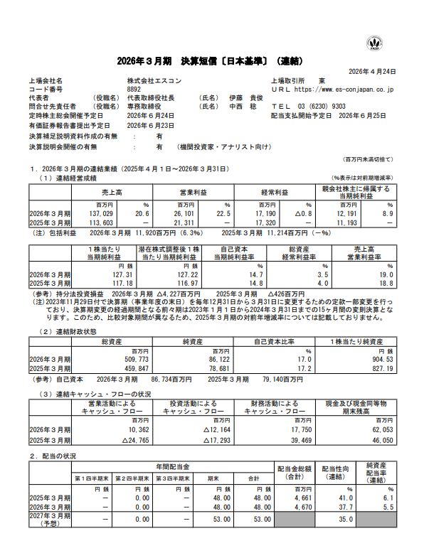 【決算】エスコン:26年3月期は売上高・営業益が過去最高、不動産開発が収益けん引