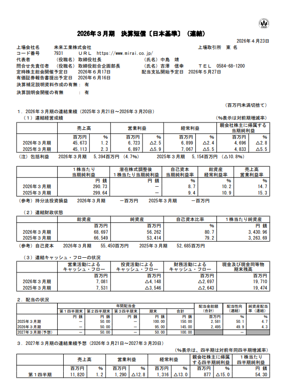 【決算】未来工業:26年3月期は売上高が過去最高、価格改定浸透も原材料高で減益