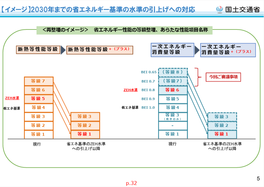 国交省はあわせて、2030年までに新築住宅の省エネ基準をZEH水準に引き上げる方針を整理する。これに伴い、現行の「等級1」を引き上げ後の義務基準に再定義し、ZEH水準(現行等級6)を新たな基準レベルに位置づける案を検討中だ。制度改定により等級体系が変わることを踏まえ、消費者が混乱しないよう、名称や評価方法の継続性を重視する考えを示している。