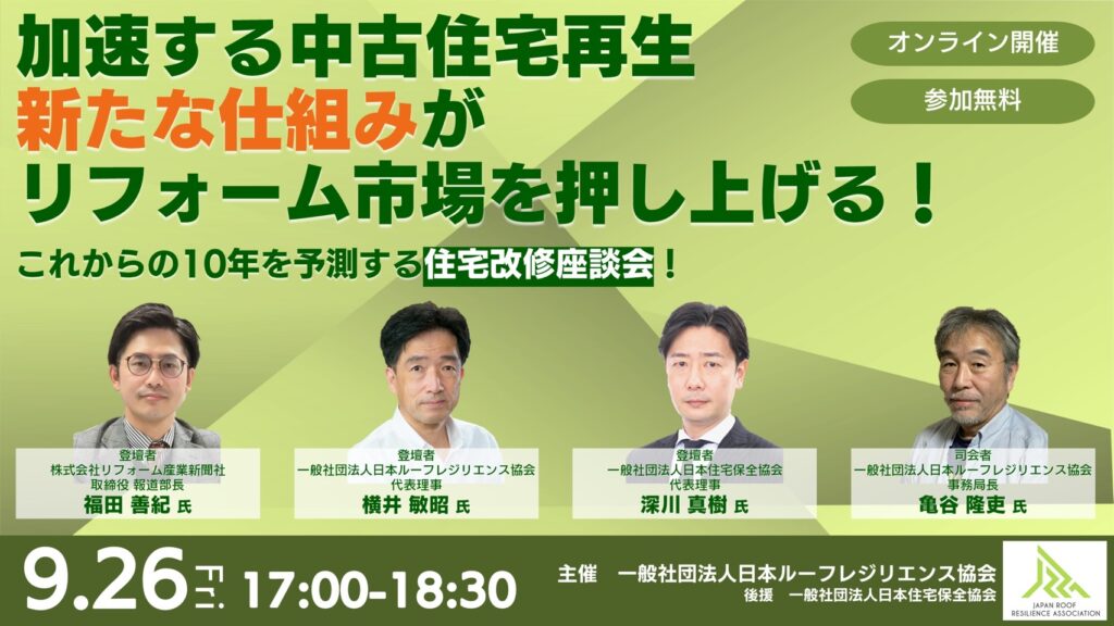 こうした潮流の中、一般社団法人日本ルーフレジリエンス協会は9月26日、「加速する中古住宅再生 新たな仕組みがリフォーム市場を押し上げる」と題したオンラインセミナーを開催した。屋根改修を中心に住宅ストックの価値向上を目指す同協会が主催し、横井代表理事、リフォーム産業新聞の福田取締役、日本住宅保全協会の深川代表理事、同協会の亀谷事務局長が登壇。今後10年の住宅改修市場の展望を語った。参加者は約100社150人と、業界関係者の関心の高さを示した。