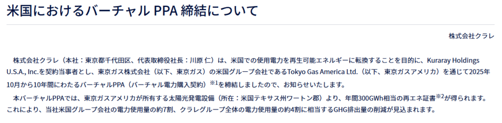 クラレは、米国での電力を再生可能エネルギーへ転換するため、東京ガスグループのTokyo Gas Americaを通じて10年間のバーチャルPPAを締結した。米テキサス州の太陽光発電設備から年間約300GWh分の再エネ証書を取得し、米国グループの電力使用量の約7割、グループ全体の約4割に相当する温室効果ガス排出削減が見込まれる。
