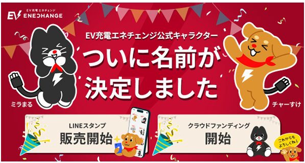 ミライズエネチェンジは、EV充電サービスの公式キャラクター名を「チャーすけ」と「ミラまる」に決定した。全国2,127件の応募から選定されたもので、いぬの男の子「チャーすけ」は“チャージする”体験、ねこの女の子「ミラまる」は社名の「ミライズ」に由来する。EVライフの楽しさを届ける存在としてブランド認知の強化を図る。