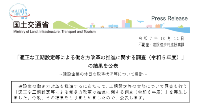 ▷「適正な工期設定等による働き方改革の推進に関する調査(令和6年度)」の結果を公表