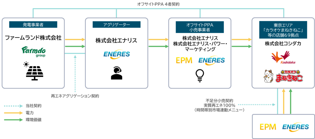 群馬県安中市に設置された専用の太陽光発電設備(容量2,255kW)で発電した電力を供給し、不足分は非化石証書付き再エネで補う。供給電力量は年間約1,269万kWhのうち約19%に相当。追加性のある再エネ活用を通じ、コシダカは2030年までに自社再エネ電力の30%以上を追加性のあるものに切り替える方針を掲げる。エナリスとEPMは企業の脱炭素化支援を強化し、PPAや自己託送など多様な再エネメニューを展開している。