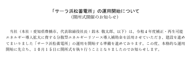 ▷「サーラ浜松蓄電所」の運用開始について(開所式開催のお知らせ)