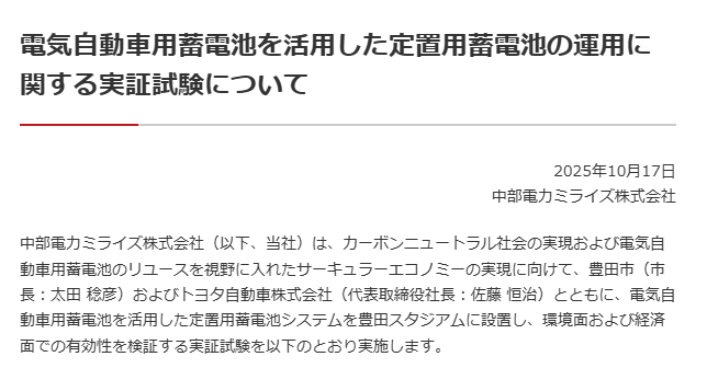 中部電力ミライズは、豊田市およびトヨタ自動車と連携し、電気自動車用蓄電池を活用した定置用蓄電池の実証試験を豊田スタジアムで開始する。リユース電池を用いたカーボンニュートラル実現とサーキュラーエコノミーの推進が狙い。2025年11月に準備を始め、2026年6月から2031年5月まで運用効果を検証する。