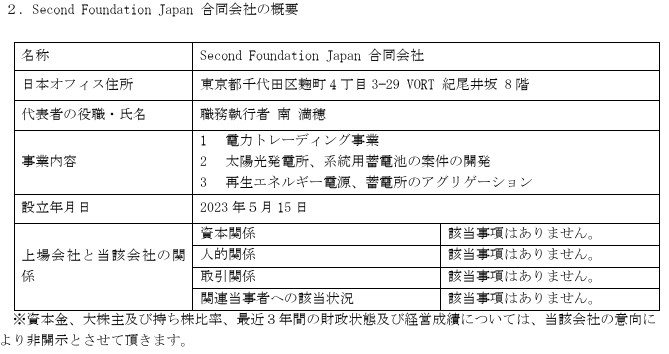 ▷Second Foundation Japan 合同会社との 系統用蓄電所事業の運用における業務提携に関するお知らせ