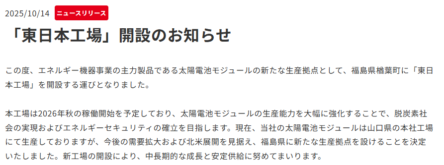 東日本工場は福島県双葉郡楢葉町下繁岡北谷地16番地に立地し、敷地面積3万1239.7㎡、延床面積1万6709㎡の規模で整備される。従業員数は50名を予定。2026年春に開設し、同年秋に本格稼働する計画。再エネの普及と技術革新を進め、脱炭素社会の実現およびエネルギーセキュリティの確立を目指す。生産拠点の分散化により、中長期的な供給安定と企業成長を図る。