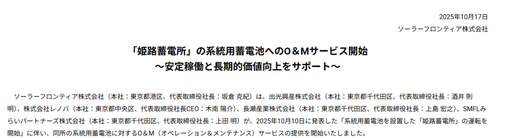 【蓄電関連】ソーラーフロンティア:「姫路蓄電所」系統用蓄電池へのO&Mサービスを開始