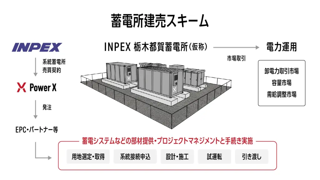 パワーエックスが、INPEXから高圧系統蓄電所1拠点を「蓄電所建売スキーム」で初受注した。用地取得から自社製蓄電システム「Mega Power 2700A」、系統接続手続きまでを一括提供する仕組みで、2026年12月に運転開始を予定。栃木市に新設する「INPEX栃木都賀蓄電所(仮称)」が対象となる。