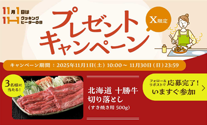 日本電機工業会(JEMA)は、IHクッキングヒーターの普及促進を目的に、11月1日を「IHクッキングヒーターの日」と制定し、啓発活動を展開している。2025年度は国内販売開始から35周年を迎えることを記念し、X(旧Twitter)でのフォロー&リポストによるプレゼントキャンペーンを実施。抽選で3名に北海道十勝牛すき焼き用500gが当たる。応募期間は11月1日から30日まで。