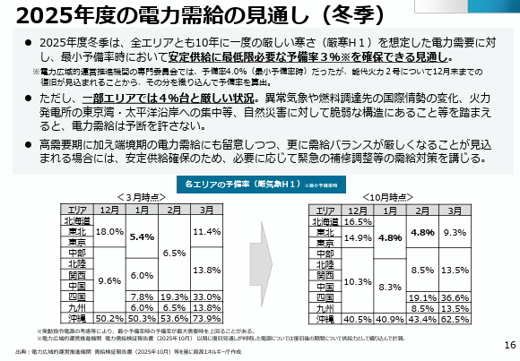 経済産業省は、2025年度冬季の電力需給対策をまとめた。全国の予備率(需要に対する供給余力)はすべてのエリアで最低限必要な3%を上回る見通しとなり、今冬は節電要請を行わない方針を決定。ただし、老朽火力の稼働リスクや異常気象・地政学リスクを踏まえ、需給の安定に向けた警戒を継続する。発電事業者には保安管理の徹底を要請し、トラブル発生時には機動的な補修や供給力追加などを実施する体制を整える。