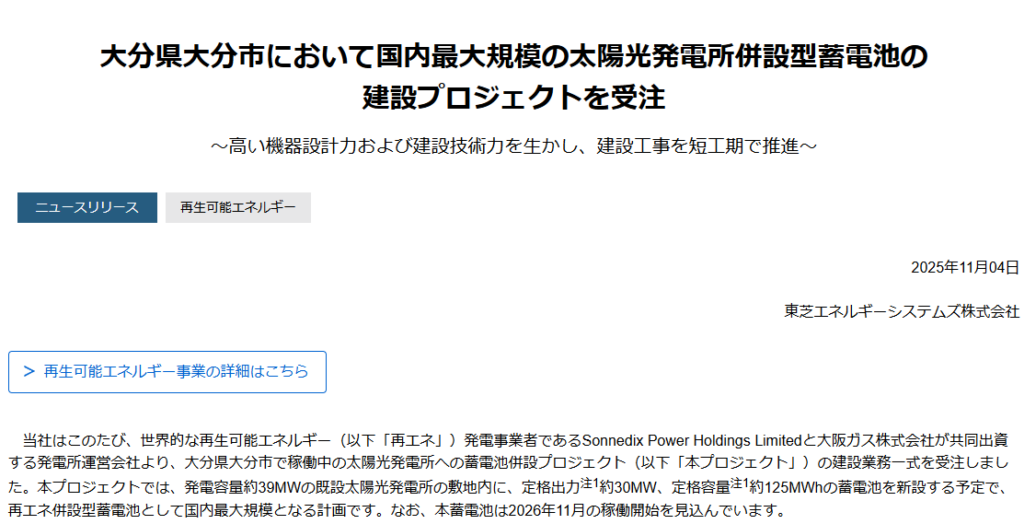 東芝エネルギーシステムズは、大分県大分市で国内最大規模となる太陽光発電所併設型蓄電池の建設を受注した。発電容量約39MWの既設太陽光発電所敷地内に、定格出力約30MW、定格容量約125MWhの蓄電池を新設するもので、2026年11月の稼働開始を予定している。Sonnedix Power Holdingsと大阪ガスが共同出資する発電所運営会社からの受注であり、同社にとって再エネ併設型蓄電池として初の大型案件となる。