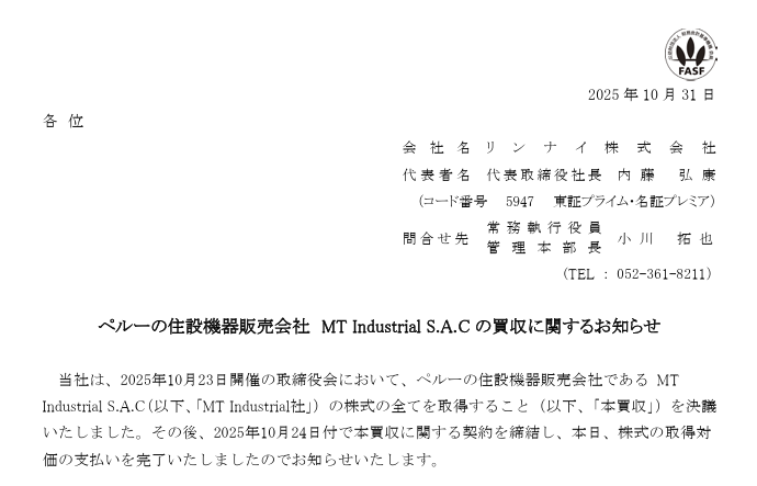 リンナイは、ペルーの住宅設備機器販売会社MT Industrial S.A.Cの全株式を取得し、同社を子会社化した。取締役会で10月23日に決議し、翌24日に契約締結、31日に対価支払いを完了した。MT Industrialは1980年創業、2013年設立で、給湯器や厨房機器、家電、衛生設備の販売と保守を手がけ、2024年の売上高は約98億円。ペルー国内で高いシェアを持つ有力企業である。