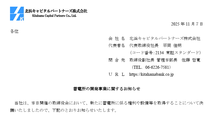 【蓄電関連】北浜キャピタルパートナーズ:京都・京丹後市で系統用蓄電所の開発権を取得、売上6億円を見込む