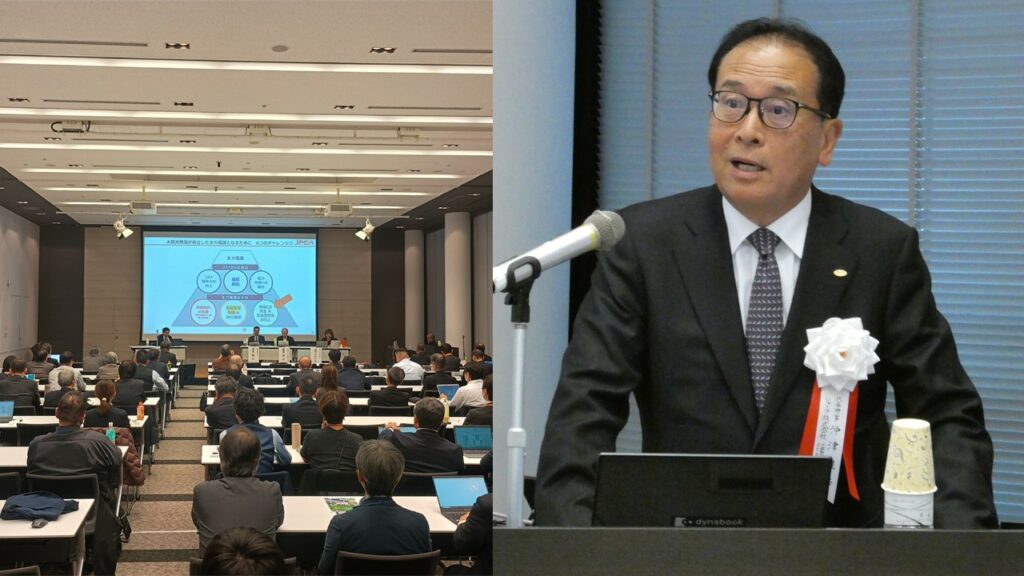 東京理科大学の植田譲教授は「太陽光発電300GW導入への挑戦」と題して講演。高効率モジュールと蓄電池によるリパワリング、既存メガソーラーの「第二世代化」を提唱。営農型についても「作物の品質や地域の付加価値を高める農業支援型PVへの転換」を促し、両面受光型や追尾架台などの技術が農業と共存できることを示した。その後、JPEA増川事務局長を交えたパネルディスカッションが行われ地域共生の在り方について議論を深めた。