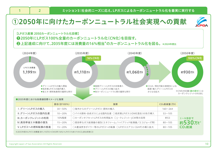 日本LPガス協会は、業界の脱炭素化に向けた長期方針「2050ミッション」と中期施策「2030アジェンダ」を策定した。2050年にLPガス全量のカーボンニュートラル(CN)化を目指し、2035年度には消費量の16%相当をCN化する段階目標を設定。グリーンLPガスの輸入・国産化、省エネ機器の普及、燃料転換、カーボンクレジット活用など5本柱で推進する。2035年度時点で約530万トンのCO₂削減を見込む。