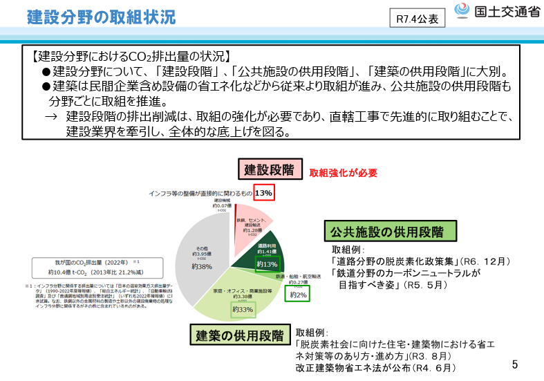 脱炭素化の流れは公共工事にも波及しており、発注者側がイノベーションを後押しする仕組みづくりが求められてきた。国土交通省は今回の取り組みを踏まえ、実効性のある現場運用モデルの構築を進め、建設分野の排出削減をけん引する姿勢を強めている。