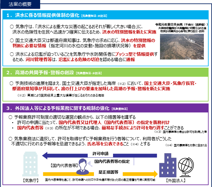 改正案では、洪水の危険性が切迫した際に気象庁が新たに「洪水の特別警報」を発表できる仕組みを創設するほか、国土交通大臣や都道府県知事が判断に必要な情報を提供する体制を整備する。また、河川管理者には氾濫が迫る場合の通報を求め、情報連携の強化を図る。高潮については、波の打上げ要素を含めた共同予報・警報を国・気象庁・都道府県が合わせて実施する制度を設ける。