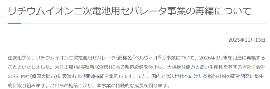 【蓄電関連】住友化学:電池用セパレータ事業を再編し韓国拠点へ集約