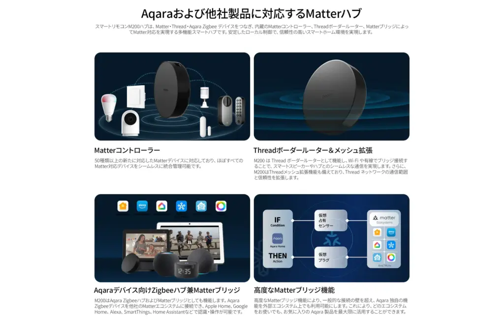 スマートリモコンM200ハブは、50種類以上のMatter対応機器の統合管理に加え、Threadメッシュ拡張による安定接続、Aqara ZigbeeハブおよびMatterブリッジ機能により、Apple HomeやGoogle Home、Alexa、SmartThingsなど他社エコシステムとの連携を可能にする構成となる。赤外線学習によりエアコンなど既存家電もMatterエコシステムに取り込み、センサーとの組み合わせで自動温度管理など高度なオートメーションを構築できる点も特徴となる。PoEとデュアルバンドWi-Fi、ローカルで動作する自動化エンジン、内蔵スピーカーによる通知・アラート機能などを備え、オープンかつプライバシー性にも配慮したスマートホーム基盤として普及拡大を図る姿勢がうかがえる。