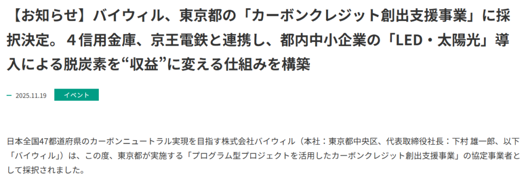 【お知らせ】バイウィル、東京都の「カーボンクレジット創出支援事業」に採択決定。4信用金庫、京王電鉄と連携し、都内中小企業の「LED・太陽光」導入による脱炭素を“収益”に変える仕組みを構築