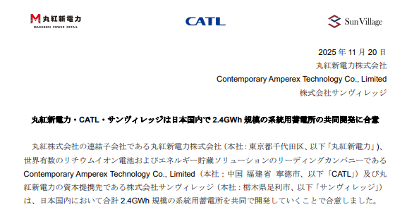 【蓄電関連】丸紅新電力:CATL・サンヴィレッジと国内2.4GWh蓄電所の共同開発に合意