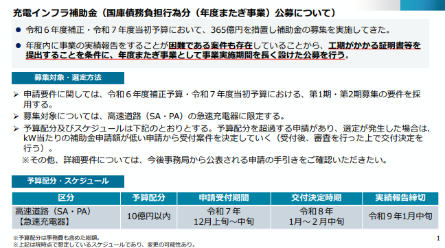 【政策】経産省:高速道路向け急速充電器を対象に年度またぎ補助の概要を発表