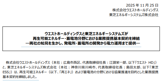 【提携・M&A・新会社】ウエストホールディングス:東芝エネルギーシステムズと再エネ・蓄電池分野で業務提携