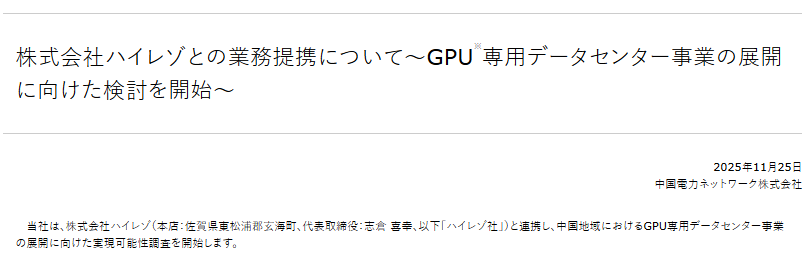 【AI・IoT・DX】中国電力ネットワーク:GPU専用データセンター事業でハイレゾと提携